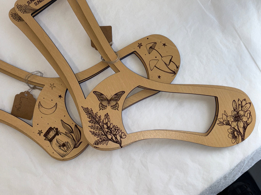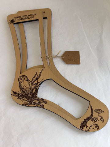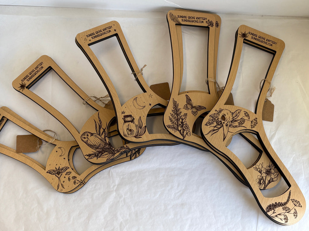 These 0.25" thick wooden sock blockers are perfect for shaping your handmade knitted socks. The wood has multiple cutouts that will allow for quick drying and features a beautiful luna moth design with plants, crescent moon and stars. This tool is also great for sizing your knitting sock project while creating them.